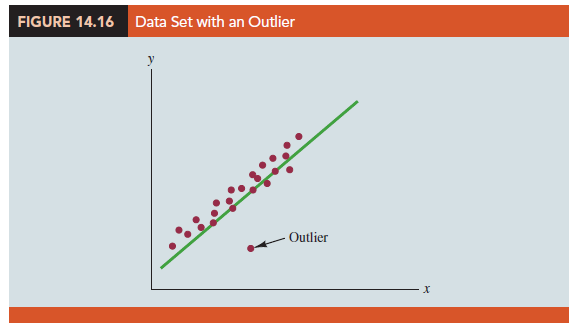 Figure 14.16 is a scatter diagram for a data set that contains an outlier, a data point (observation) that does not fit the trend shown by the remaining data. Outliers represent observations that are suspect and warrant careful examination. They may represent erroneous data; if so, the data should be corrected. They may signal a violation of model assumptions; if so, another model should be considered. Finally, they may simply be unusual values that occurred by chance. In this case, they should be retained.