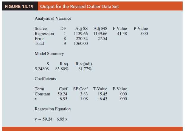 In deciding how to handle an outlier, we should first check to see whether it is a valid observation. Perhaps an error was made in initially recording the data or in entering the data into the computer file. For example, suppose that in checking the data for the outlier in Table 14.11, we find an error; the correct value for observation 4 is x4 = 3, y4 = 30. Figure 14.19 is a portion of the output obtained after correction of the value of y4. We see that using the incorrect data value substantially affected the goodness of fit. With the correct data, the value of R-sq increased from 49.68% to 83.8% and the value of b0 decreased from 64.96 to 59.24. The slope of the line changed from -7.33 to -6.95.