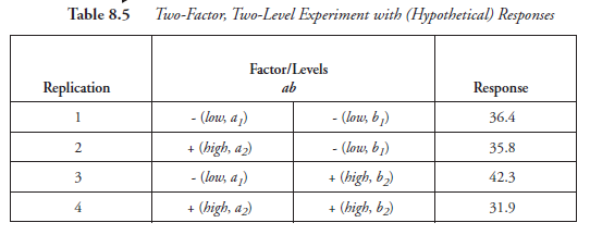 Table 8.5 shows the replication results of all combinations possible (full factorial) with two factors, a and b, with a at two levels, a1 and a2, and b at two levels, b1 and b2. The number of combinations is given by lf = 22 = 4.