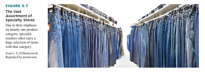 Consumers often shop at specialty stores because of the knowledgeable sales personnel, the variety of choices within a given category, customer service, intimate store size and atmosphere (although this is not true of the category killer store), the lack of crowds (also not true of the category killer store), and the absence of aisles of unrelated merchandise that they must pass through. Some specialty stores have elaborate fixtures and upscale merchandise for affluent shoppers, whereas others are discount-oriented and aim at price-conscious consumers. See Figure 5-7.