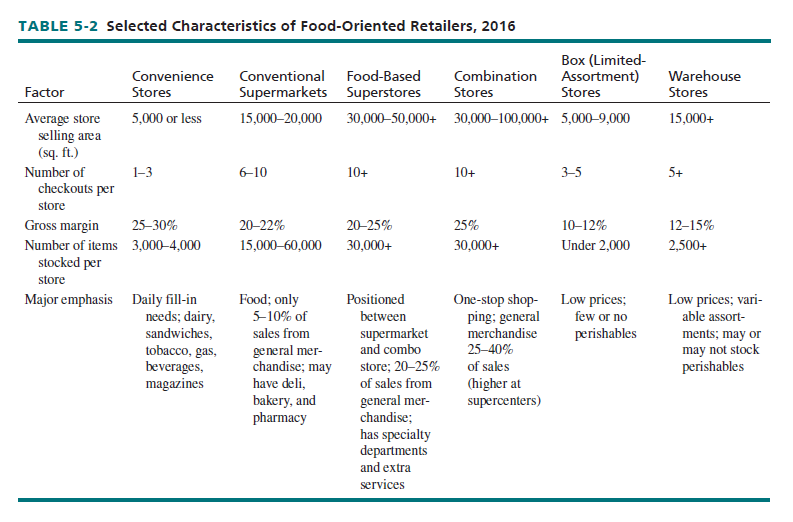 Many people do not like shopping in warehouse settings. Also, because products are usually acquired through special deals, brands may be temporarily or permanently out of stock. Table 5-2 shows selected characteristics for the food-oriented retailers just described.