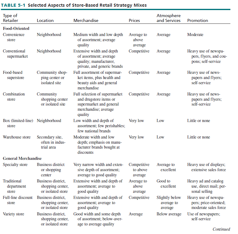 Selected aspects of the strategy mixes of 14 store-based retail institutions, divided into food- oriented and general merchandise groups, are highlighted in this section and in Table 5-1. Although not all-inclusive, these strategy mixes provide a good overview of store-based strategies. Please note that width of assortment is the number of different product lines carried by a retailer; depth of assortment is the selection within the product lines stocked.