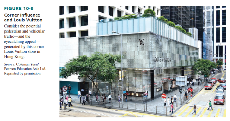 Placement in the location is a site’s relative position in the district or center. A corner location may be desirable because it is situated at the intersection of two streets and has “corner influence.” It is usually more expensive because of the greater pedestrian and vehicular passersby due to traffic flows from two streets, increased window display area, and less traffic congestion through multiple entrances. Corner influence is greatest in high-volume locations. That is why some Pier 1 stores, Starbucks restaurants, and other retailers seek corner sites. See Figure 10-9.