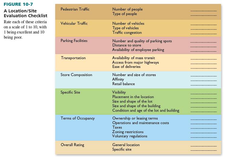 Figure 10-7 has a location/site evaluation checklist. A retailer should rate each alternative location (and specific site) on all the criteria and develop overall ratings for them. Two firms may rate the same site differently. This figure should be used in conjunction with the trading-area data in Chapter 9, not instead of them.