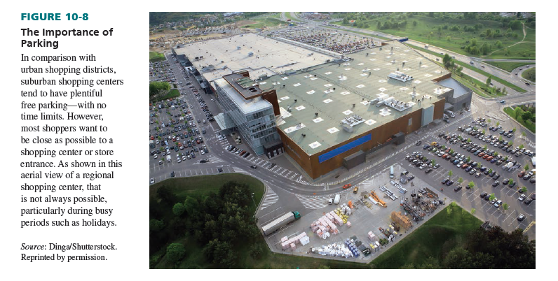 Many U.S. retail stores include some provision for nearby off-street parking. In many business districts, parking is provided by individual stores, arrangements among stores, and local government. In planned shopping centers, parking is shared by all stores there. The number and quality of parking spots, their distances from stores, and the availability of employee parking should all be evaluated. See Figure 10-8.