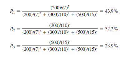 Assume a leased department operator studies three possible locations with 200, 300, and 500 total square feet of store space allocated to men’s cologne (by all retailers in the areas). A group of potential customers lives 7 minutes from the first location, 10 minutes from the second, and 15 minutes from the third. The operator estimates the effect of travel time to be 2. Therefore, the probability of consumers’ shopping is 43.9 percent for Location 1, 32.2 percent for Location 2, and 23.9 percent for Location 3: