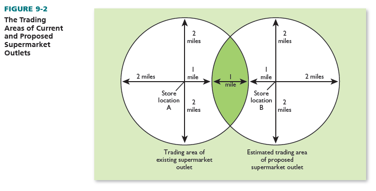 - A chain retailer learns whether the location of a proposed new store will reach additional customers or take business from existing stores. Suppose a supermarket chain has a store in Jackson, Mississippi, with a trading area of 2 miles, and it considers adding a new store, three miles from the Jackson branch. Figure 9-2 shows the distinct trading areas and expected store overlap. The shaded portion represents the trading-area overlap, where the same customers are served by both branches. The chain must look at the overall net increase in sales if it adds the proposed store (total revised sales of existing store + total sales of new store — total previous sales of existing store).