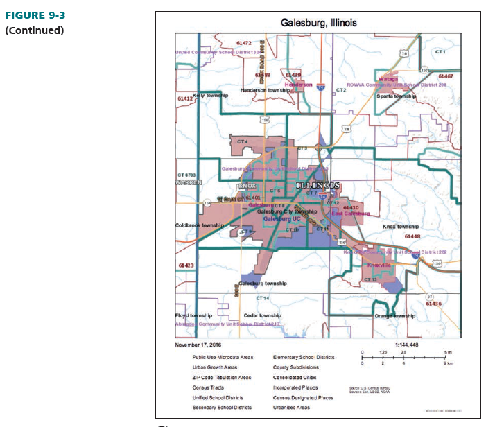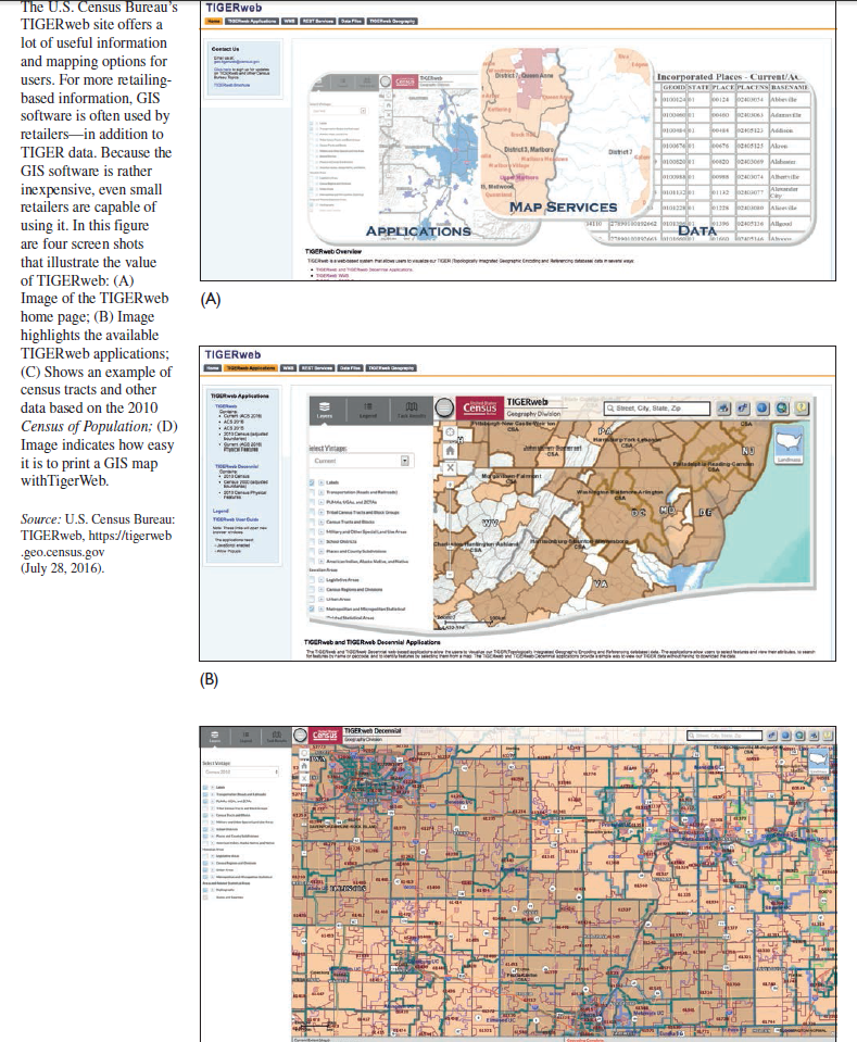 Most GIS software programs are extrapolated from the decennial Census of Population and the U.S. Census Bureau’s national digital map (known as TIGER—topologically integrated geographic encoding and referencing).4 TIGER incorporates all streets and highways in the United States. TIGER files may be accessed online free using its web-based platform TIGERweb or as Shapefiles downloads. TIGERweb’s Web Map Service (WMS) maps may be adapted to reflect census tracts, railroads, highways, waterways, and other physical attributes of any U.S. area, but they do not show retailers or other commercial entities. Many versions of the TIGER data are available for download and adaptation based on level of detail.5 See Figure 9-3 shows the breadth of TIGER services.