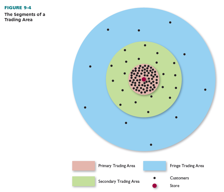 Each trading area has three parts: The primary trading area encompasses 50 to 80 percent of a store’s customers. It is the area closest to the store and possesses the highest density of customers to population and the highest per capita sales. There is little overlap with other trading areas. The secondary trading area contains an additional 15 to 25 percent of a store’s customers. It is located outside the primary area, and customers are more widely dispersed. The fringe trading area includes all the remaining customers, and they are the most widely dispersed. A store could have a primary trading area of 4 miles, a secondary trading area of 5 miles, and a fringe trading area of 10 miles. The fringe trading area typically includes some outshoppers who travel greater distances to patronize certain stores.