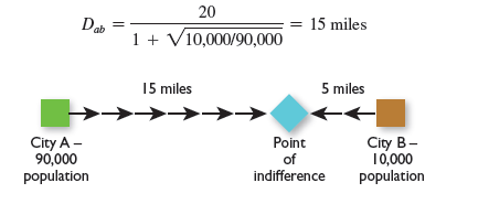 A city with a population of 90,000 (A) would draw people from three times the distance as a city with 10,000 (B). If the cities are 20 miles apart, the point of indifference for the larger city is 15 miles, and for the smaller city, it is 5 miles: