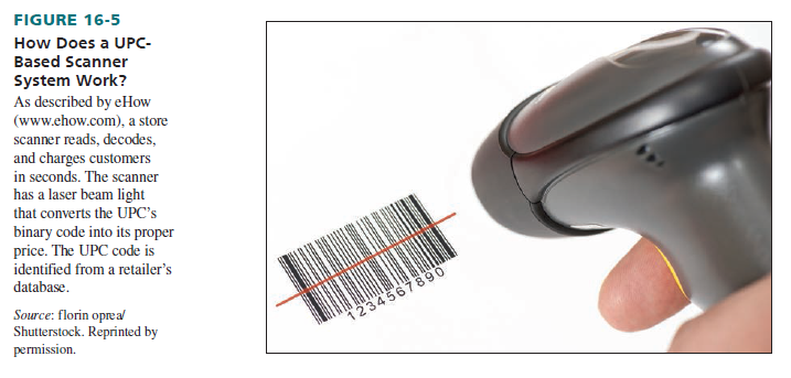Current POS systems are easy to network; they have battery backup capabilities and run with standard PCs and software. Many of these systems use optical scanners to transfer data from products to computers by wands or other devices that pass over sensitized strips on the items. Figure 16-5 shows how barcoding works. As noted earlier, the UPC is the dominant format for coding data onto merchandise. This is how to interpret a barcode: