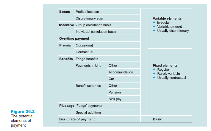 Once the mechanisms for determining rates of pay for jobs in an organisation have been settled, the second key strategic decision relates to the make-up of the pay package. Here there is a great deal of potential choice available. What is included and to what extent are matters which should be decided with a view to supporting the organisation’s objectives and encouraging the necessary attitudes and actions on the part of employees. The payment of an individual will be made up of one or more elements from those shown in Figure 26.2. Fixed elements are those that make up the regular weekly or monthly payment to the individual, and which do not vary other than in exceptional circumstances. Variable elements can be varied by either the employee or the employer.