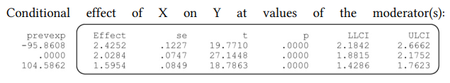 We can see from the Model table the coefficients (coeff), standard deviations (se), t values, p values, the lower limit 95% confidence interval (LLCI), and the upper limit 95% confidence interval (ULCI). The first place to look on this table is at the p value for the interaction (int_1). We have circled the interaction line in the above output. Here we see that p < .001, which indicates that the interaction of previous experience and beginning salary is statistically significant, which is interpreted in moderation analysis as the moderator (previous experience) is moderating the relationship between beginning salary and current salary.