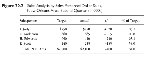 Edwards missed the mark by the largest amount (though Edwards’ performance against quota was better the Scott’s), so the sales manager next asks for a breakdown (sales analysis) of Edwards’ sales by class of account (A = large accounts, B = medium-sized accounts, and C = small accounts). Figure 20.3 shows this sales analysis. Edwards’ sales performance by class of account indicates the most success in selling smaller accounts, but across the board it has been below par.