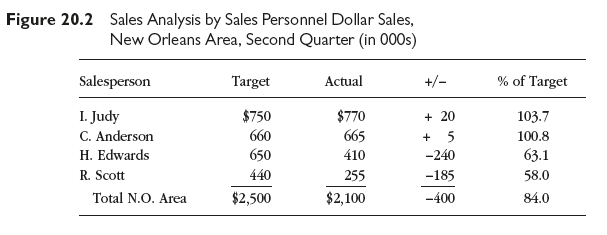 The sales manager wants more details about the Charlotte and New Orleans situations. It is decided to probe the New Orleans sales area first, as it had a sales deficit of $400,000, greater than the deficit for the entire region ($370,000). The first sales analysis furnished details on the four members of the sales force assigned to the New Orleans area (see Figure 20.2). Edwards and Scott are responsible for the area’s poor quota performance.
