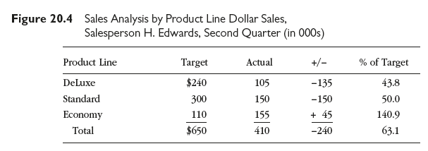 The sales manager next asks for a sales analysis of Edwards’ sales by product line. Figure 20.4 shows this analysis. Edwards has poor performance in the DeLuxe and Standard lines, but goes over quota in the Economy line.