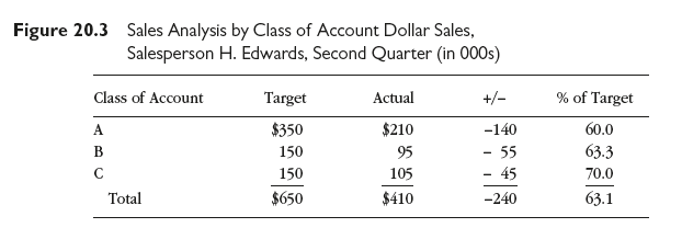 Edwards missed the mark by the largest amount (though Edwards’ performance against quota was better the Scott’s), so the sales manager next asks for a breakdown (sales analysis) of Edwards’ sales by class of account (A = large accounts, B = medium-sized accounts, and C = small accounts). Figure 20.3 shows this sales analysis. Edwards’ sales performance by class of account indicates the most success in selling smaller accounts, but across the board it has been below par.