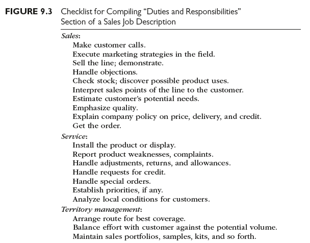 An alternative approach to developing the “job duties and responsibilities” section of the job description is to use a checklist of activities and subactivities generally accepted as comprising salespersons” jobs. One checklist, originally put together for the U.S. Small Business Administration, is shown in Figure 9.3. This approach is helpful in preparing tentative descriptions of newly created sales jobs.