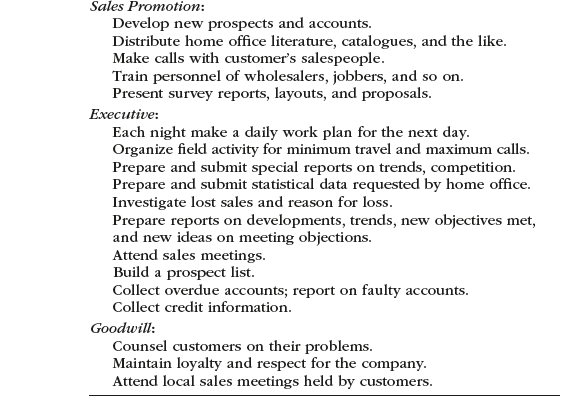 - Classify the duties into major responsibility groupings, such as sales, service, territory management, sales promotion, executive, and goodwill duties.