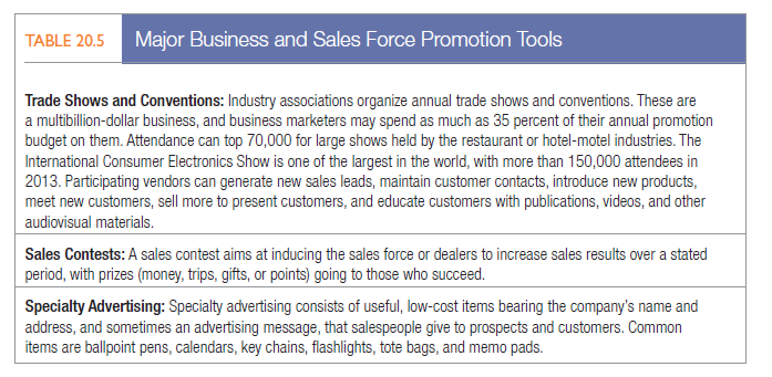 SELECTING BUSINESS AND SALES FORCE PROMOTION TOOLS Companies spend billions of dollars on business and sales force promotion tools (see Table 20.5) to gather leads, impress and reward customers, and motivate the sales force.62 They typically develop budgets for tools that remain fairly constant from year to year. For many new businesses that want to make a splash to a targeted audience, especially in the B-to-B world, trade shows are an important tool, but the cost per contact is the highest of all communication options.
