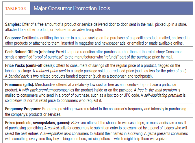 SELECTING CONSUMER PROMOTION TOOLS The promotion planner should take into account the type of market, sales promotion objectives, competitive conditions, and each tool’s cost-effectiveness. The main consumer promotion tools are summarized in Table 20.3. Manufacturer promotions in the auto industry, for instance, are rebates, gifts to motivate test-drives and purchases, and high-value trade-in credit. Retailer promotions include price cuts, feature advertising, retailer coupons, and retailer contests or premiums.58