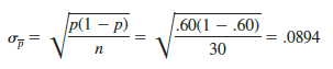 For the EAI study we know that the population proportion of managers who participated in the management training program is p = .60. With n/N = 30/2500 = .012, we can ignore the finite population correction factor when we compute the standard error of the proportion. For the simple random sample of 30 managers, σp is