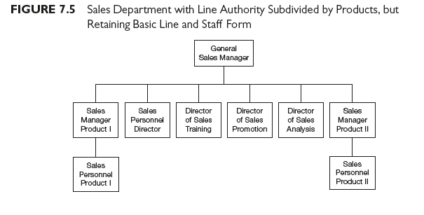 Figures 7.5 and 7.6 illustrate two schemes for dividing line authority by products. In Figure 7.5, the customary line and staff organization has been retained; in Figure 7.6, the primary division is on the basis of products, and each product sales manager has his own staff of specialists.