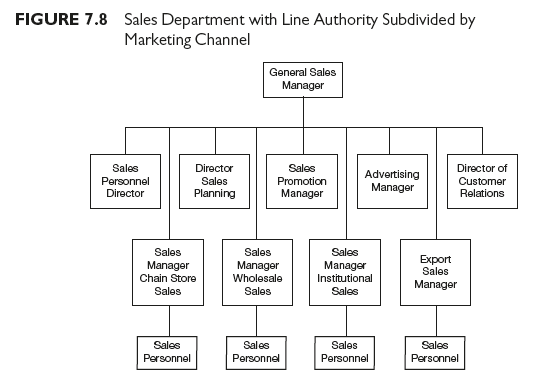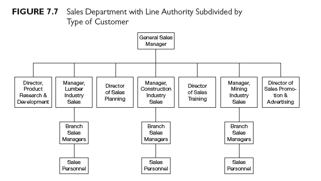 The third scheme for subdividing line authority is by type of customer (Figure 7.7) or marketing channel (Figure 7.8). This is appropriate when nearly identical products are marketed to several types of customers and the problems of selling to each type are different. When the same, or similar, products are sold to a number of industries, they often find different applications in each industry. The company in Figure 7.7 sells its products to the lumber, construction, and mining industries. In each industry, the products are used for different purposes. Customers not only have different needs, they are influenced by different buying motives. Thus, special sales forces sell to each major type of customer.