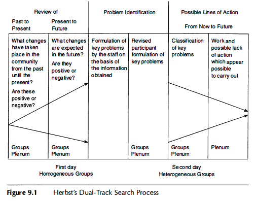 Herbst (1980) illustrates the search process as a dual track. Figure 9.1 conveys an overall conception of the search as a generative and creative process (building shared history and visions, generating creative action possibilities, reflecting on the feasibility of action possibilities, and finally working out priorities among the possible action items).