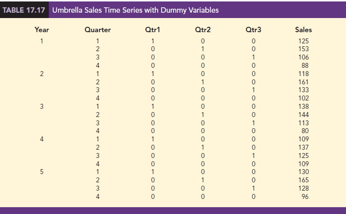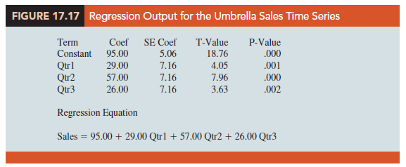 Table 17.17 is the umbrella sales time series with the coded values of the dummy variables shown. Using the data in Table 17.17, we obtained the computer output, a portion of which is shown in Figure 17.17. The estimated multiple regression equation obtained is