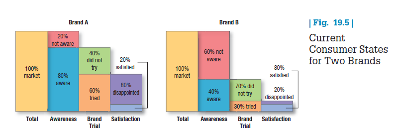 Figure 19.5 provides an example of good feedback measurement. We find 80 percent of the consumers in the total market are aware of brand A, 60 percent have tried it, and only 20 percent who tried it are satisfied. This indicates that the communications program is effective in creating awareness, but the product fails to meet consumer expectations. In contrast, 40 percent of the consumers in the total market are aware of brand B and only 30 percent have tried it, but 80 percent of them are satisfied. In this case, the communications program needs to be strengthened to take advantage of the brand’s potential power.