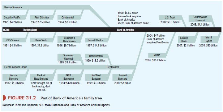 The banking industry is another example. During the financial crisis many banking mergers involved rescues of failing banks by larger and stronger rivals. But most earlier bank mergers involved successful banks that sought to achieve economies of scale. The United States entered the 1980s with far too many banks, largely as a result of outdated restrictions on interstate banking. As these restrictions eroded and communications and technology improved, small banks were swept up into regional or “super-regional” banks, and the number of banks declined from over 14,000 to little more than 5,000. For example, look at Figure 31.2, which shows some of the acquisitions by Bank of America and its predecessor companies. The main motive for these mergers was to reduce costs.