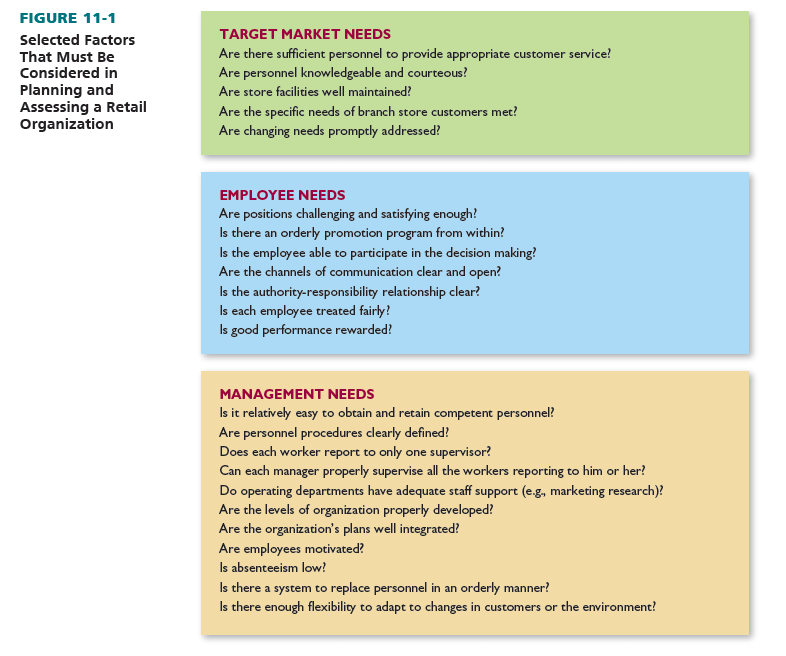 Through a retail organization, a firm structures and assigns tasks (functions), policies, resources, authority, responsibilities, and rewards to efficiently and effectively satisfy the needs of its target market, employees, and management. Figure 11-1 shows various needs that should be taken into account when planning and assessing an organization’s structure.