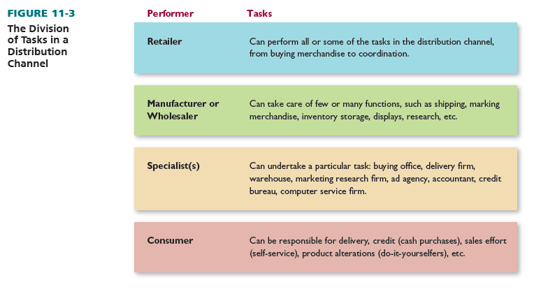Although the preceding tasks are typically performed in a distribution channel, they do not all have to be done by a retailer. Some can be completed by the manufacturer, wholesaler, specialist, or consumer. Figure 11-3 shows the types of activities that could be carried out by each party. Following are some criteria to consider in allocating the functions related to consumer credit.