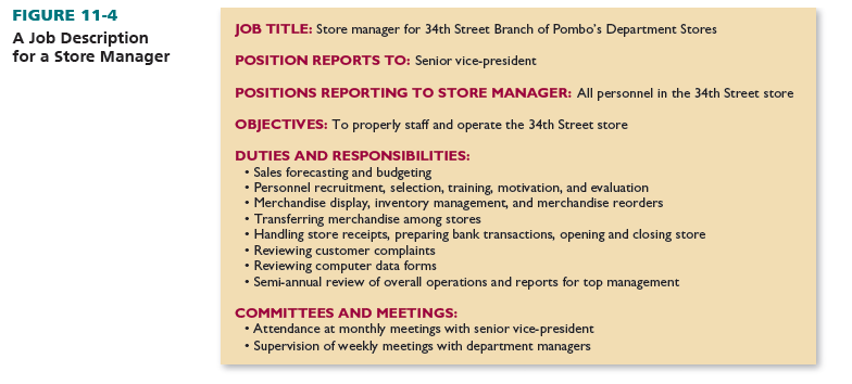 Once tasks are grouped, job descriptions are constructed. These outline the job titles, objectives, duties, and responsibilities for every position. They are used as a hiring, supervision, and evaluation tool. Figure 11-4 contains a job description for a store manager.