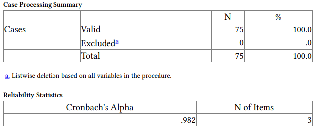 The Case Processing Summary shows that all 75 students have scores from all three judges. The Cronbach’s alpha for these three judges (called items) is .982, which we will see is the same as the average measures Intraclass Correlation Coefficient (ICC) in the last output table below.