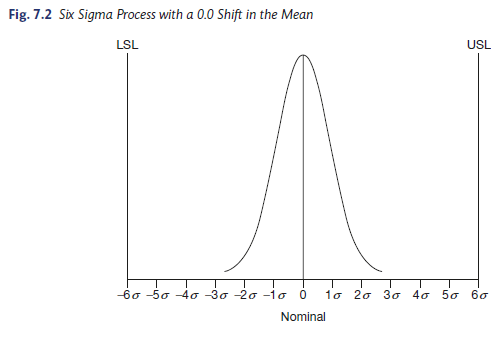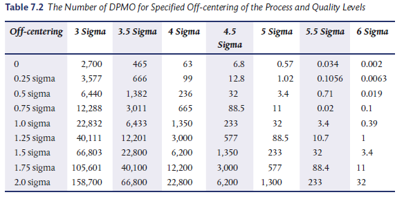 Table 7.2 shows the number of defective parts per million opportunities for specified off-centering of the process and quality levels. Note that in the table the first row shows the DPMO when there is no off-centering of the process. At Three Sigma quality level, it shows the DPMO as 2,700, while at Six Sigma quality level the DPMO is 0.002, i.e. 2 defects per billion. For an off-centering of 1.5 Sigma and Sigma quality level, the DPMO is shown as 3.4. Thus, Motorola has quality levels such that 3.4 defects per million are allowed. For a process without off-centering, 3.4 defects per million lie somewhere between 4.5 and 5 Sigma quality levels. For zero off-centering, the 4.5 Sigma quality level has a DPMO of 6.8, while 5 Sigma quality level has a DPMO of 0.57. Thus, the DPMO of 3.4 lies in between DPMO of 0.57 and 6.8, i.e. between 4.5 and 5 Sigma quality levels without off-centering.
