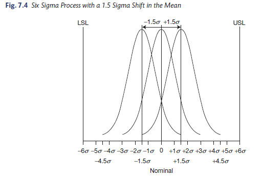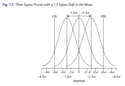 It is difficult in a real process environment to control a process in a manner that the mean exactly hits the nominal target mean. Therefore, a shift in the process has to be allowed for. Motorola’s Six Sigma quality level allows an off-centering of the process up to 1.5 Sigma.
