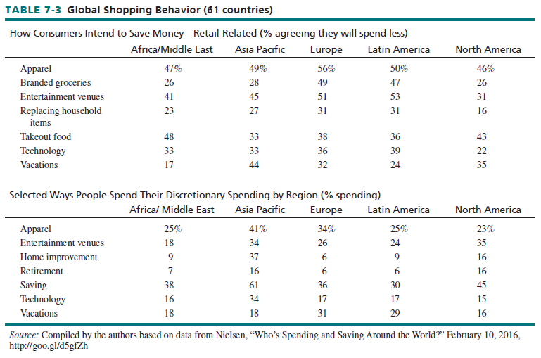 In this section, we look at people’s attitudes toward shopping, where they shop, and the way in which they make purchase decisions. The top of Table 7-3 shows how shoppers around the world say they would change their retail behavior if they needed to reduce their spending; the bottom of the table indicates how global shoppers say they would alter their behavior if they have extra money to spend. Notice the differences among people living in different regions of the world.