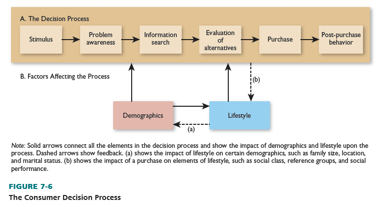 The consumer decision process has two parts: the process itself and the factors affecting the process. There are six steps in the process: stimulus, problem awareness, information search, evaluation of alternatives, purchase, and post-purchase behavior. The consumer’s demographics and lifestyle affect the process. The complete process is shown in Figure 7-6.