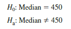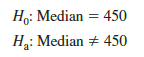If H0 cannot be rejected, we cannot conclude that p is different from .50 and thus we cannot conclude that the population median is different from 450. However, if H0 is rejected, we can conclude that p is not equal to .50 and thus the population median is not equal to 450.