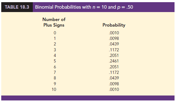 With n = 10 stores or trials and p = .50, we used Table 5 in Appendix B to obtain the binomial probabilities for the number of plus signs under the assumption H0 is true. These probabilities are shown in Table 18.3. Figure 18.1 shows a graphical representation of this binomial distribution.