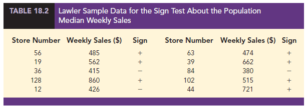 In order to demonstrate the sign test, we consider the weekly sales of Cape May Potato Chips by the Lawler Grocery Store chain. Lawler’s management made the decision to carry the new potato chip product based on the manufacturer’s estimate that the median sales should be $450 per week on a per store basis. After carrying the product for three- months, Lawler’s management requested the following hypothesis test about the population median weekly sales:
