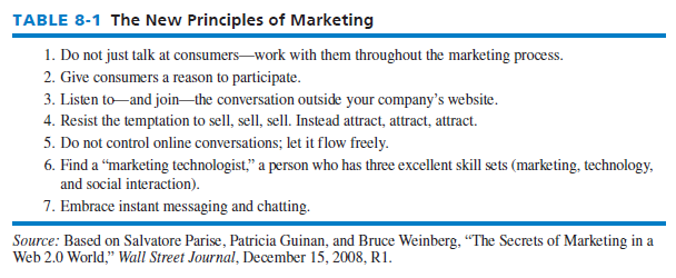 Firms benefit immensely by providing incentives to customers to share their thoughts, opinions, and experiences on the company website. Encourage customers to network among themselves on topics of their choosing on the company website. The company website must not be just about the company—it must be all about the customer too. Perhaps offer points, discounts, or coupons on the website for customers who provide ideas, suggestions, or feedback. Drive traffic to the company website, and then keep customers at the website for as long as possible with daily new material, updates, excitement, and offers. Encourage and promote customer participation and interaction. Customers trust other customers’ opinions more than a company’s marketing pitch, and the more they talk freely, the more the firm can learn how to improve its product, service, and marketing. Marketers should monitor blogs daily to determine, evaluate, and influence opinions being formed by customers. Customers must not feel like they are a captive audience for advertising at a firm’s website. Table 8-1 provides new principles of marketing according to Parise, Guinan, and Weinberg.1