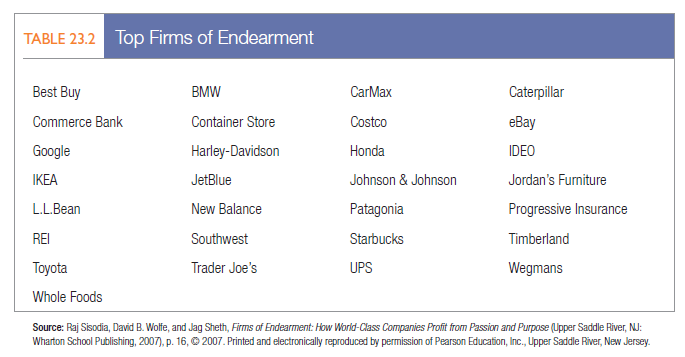 FIRMS OF ENDEARMENT Researchers Raj Sisodia, David Wolfe, and Jag Sheth believe humanistic companies make great companies. They see “Firms of Endearment” as those with a culture of caring that serve the interests of their stakeholders, who are defined by the acronym SPICE: Society, Partners, Investors, Customers, and Employees. Sisodia and colleagues believe Firms of Endearment create a love affair with stakeholders. Their senior managers run an open-door policy, are passionate about customers, and earn modest compensation. They pay their employees more, relate more closely to a smaller group of excellent suppliers, and give back to the communities in which they work. They actually spend less on marketing as a percentage of sales yet earn greater profits because customers who love the company do most of the marketing. The authors see the 21st-century marketing paradigm as creating value for all stakeholders and becoming a beloved firm. Table 23.2 lists firms receiving top marks as Firms of Endearment from a sample of thousands of customers, employees, and suppliers.