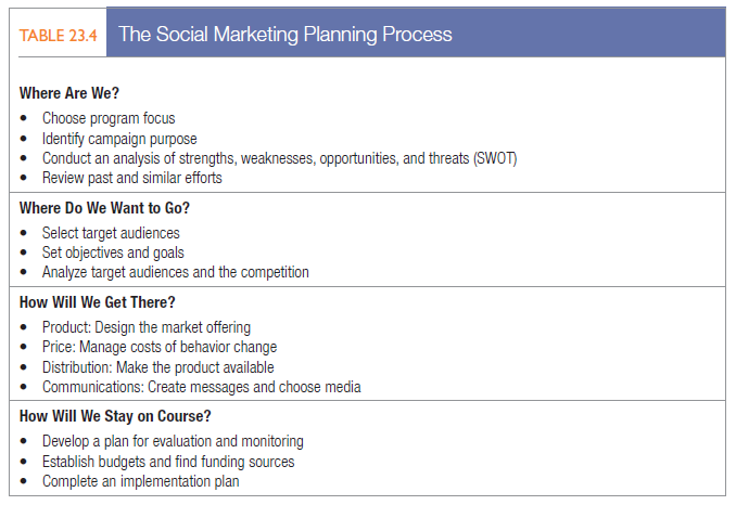 While social marketing uses a number of different tactics to achieve its goals, the planning process follows many of the same steps as for traditional products and services (see Table 23.4).69 Some key success factors for changing behavior include:70