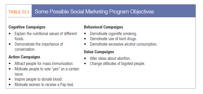 Choosing the right goal or objective for a social marketing program is critical. Should a family-planning campaign focus on abstinence or birth control? Should a campaign to fight air pollution focus on ride sharing or mass transit? Table 23.3 illustrates the range of possible objectives.