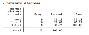 We can use these codes to create a new dummy variable, any, coded 0 for no distress and 1 for one or more distress incidents: