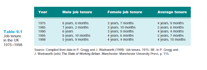 In recent years there has been a mismatch between the rhetoric about job tenure and the reality. Much mileage continues to be made by some consultants, academics and management gurus out of the claim that ‘there are no longer any jobs for life’, suggesting that the length of time we spend working for organisations has fallen substantially in recent years. In fact this is a misleading claim. All the available evidence strongly suggests that job tenure has been broadly stable for several decades. The most comprehensive study to be published in recent years was carried out by Gregg and Wadsworth (1999). Their detailed analyses of data from the New Earnings Survey, the General Household Survey and the British Labour Force Survey showed that relatively little actually changed in terms of worker retention during the latter part of the twentieth century. This is illustrated in Table 9.1 which shows how average job tenure rates fluctuated for men and women between 1975 and 1998 while the overall tenure rate for the UK as a whole remained stable. What happened over this period is that male tenure rates fell as men in their fifties and early sixties took early retirement or accepted redundancy packages, while job tenure among women rose. Gregg and Wadsworth’s study showed that the biggest increase has been among women with children. In 1975, on average, they remained in a job for 20 months; the figure in 1998 was 46 months. This reflects the greater propensity of women during this period to return to work following maternity leave and the improved career opportunities available to them. Other fluctuations are readily explained by economic conditions.