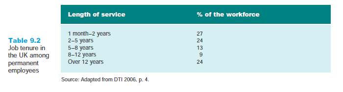 These trends appear to have continued in the first decade of the twenty-first century. While there has been no comprehensive study carried out more recently along the lines of Gregg and Wadsworth’s work, the statistics that have been published point to continuity rather than to either reduced or increased job tenure. OECD statistics show that average job tenure among permanent employees in the UK remained steady at or around eight years from 1992 until 2002 (Auer et al. 2004, p. 3), Labour Force Survey data confirming that long periods of job tenure remain the norm for a substantial portion of the working population (see Table 9.2). People tend to move from employer to employer early on in their careers, often staying in one employment for just a few months. But once they find a job (or an employer) that they like, the tendency is to remain for several years. ‘Jobs for life’ have, in truth, always been a relative rarity, but the evidence suggests that they remain a reality for many employees, despite the predictions of the management gurus. Over a third of employees have already been in their current jobs for over eight years.